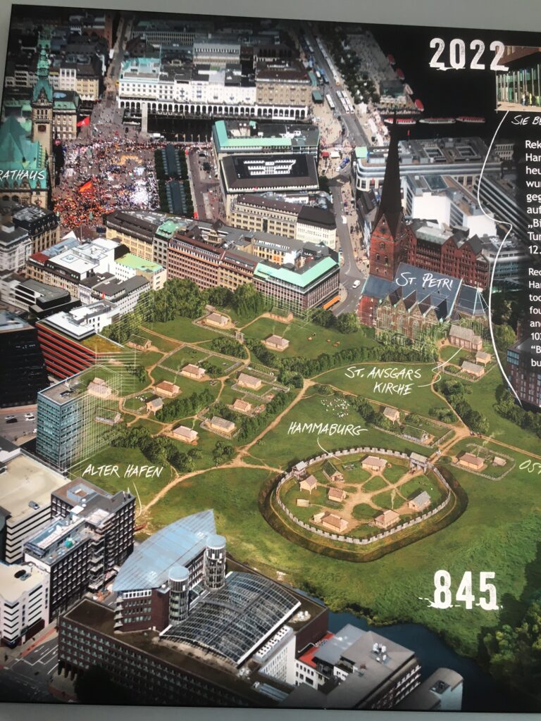 Nach einem Eis an der Alster ging es zum Abschluss noch in den Untergrund, indem wir die Fundamente der alten Bischofsburg besichtigten, dem ältesten erhaltenen Steingebäude Hamburgs, welche bei Bauarbeiten in den 1960er Jahren entdeckt wurden und nun archäologisch erschlossen sind. Ganz in der Nähe – auf dem Domplatz – wird auch die Existenz der legendären „Hammaburg“vermutet, welche als Keimzelle und Namensgeberin des heutigen Hamburg gilt.