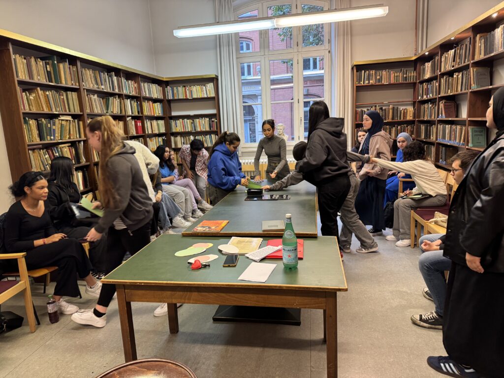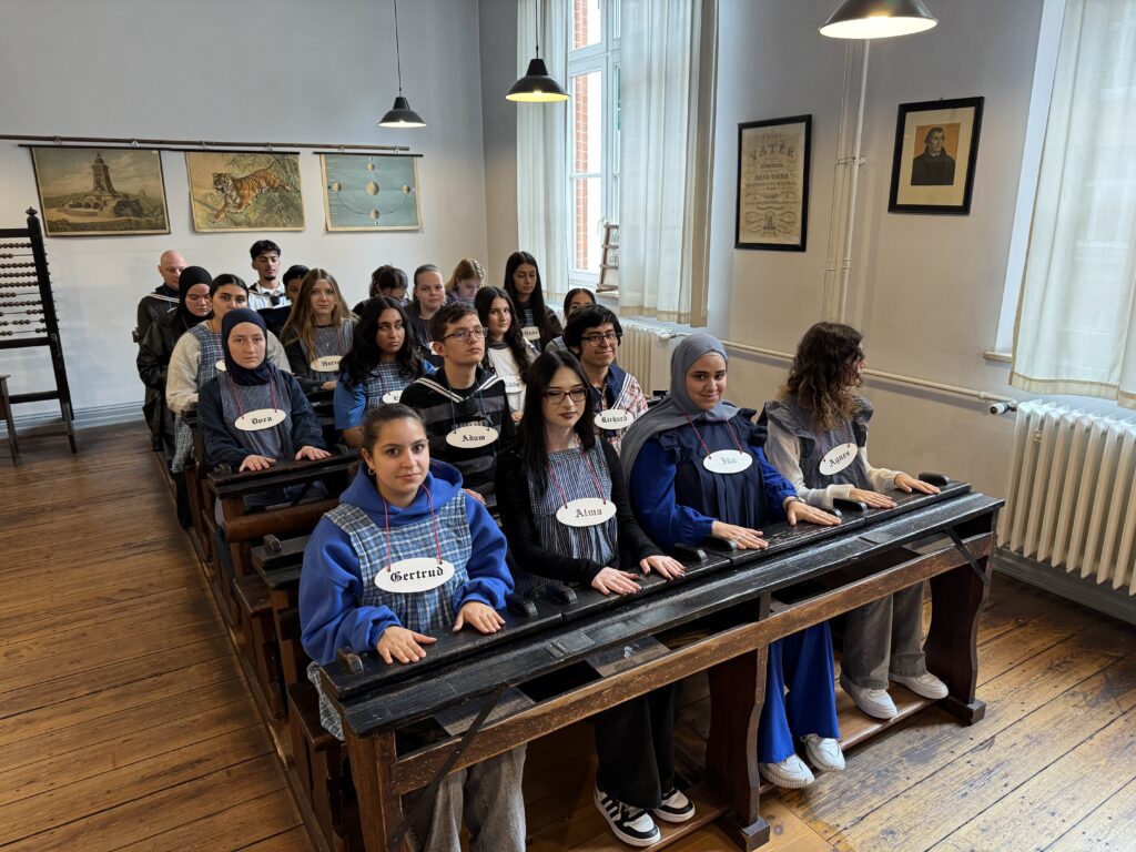 Die erste Station unseres Rückblickes war die Gestaltwoche im November 2024, wo wir uns mit „der Kindheit, Jugend und der Schule in der Kaiserzeit, der Zeit der Weimarer Republik und während des Nationalsozialismus“ beschäftigt haben. Unsere Zeitreise begann dabei in der Schule und fand ihren Höhepunkt auch in der Schule, nämlich in Gestalt des Besuchs des Hamburger Schulmuseums in der Seilerstraße, wo wir neben einer Projektarbeit auch ganz praktisch eine Schulstunde im Stil des 19. Jahrhunderts erlebten.