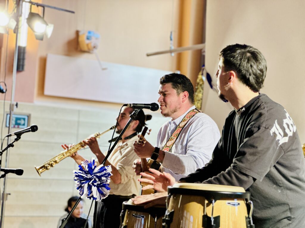 Das Moderationsteam, bestehend aus Franziska Zörner, Mischa Laufenberg und Martin Sellner, führte anschließend durch das Programm und ehrte die ersten Preisträger*innen. In einer kurzen Pause konnten sich die Gäste mit Kuchen und Waffeln stärken, die von der Klasse 7d vorbereitet worden waren. Nach der Pause sorgte das Ensemble „Sebastian, Samuel & Victor“ mit südamerikanischer Musik für weitere Begeisterung im Publikum.