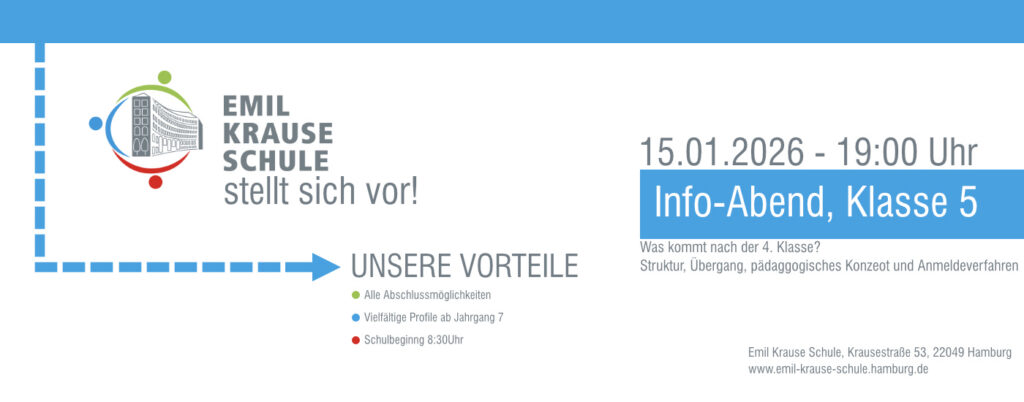 Mit unserem Infoabend für den neuen Jahrgang 5 möchten wir Ihnen die Möglichkeit geben, unsere Schule in Ruhe kennenzulernen, Fragen zu stellen und einen Eindruck davon zu bekommen, wie Lernen und Zusammenleben an der Emil-Krause-Schule gestaltet sind.